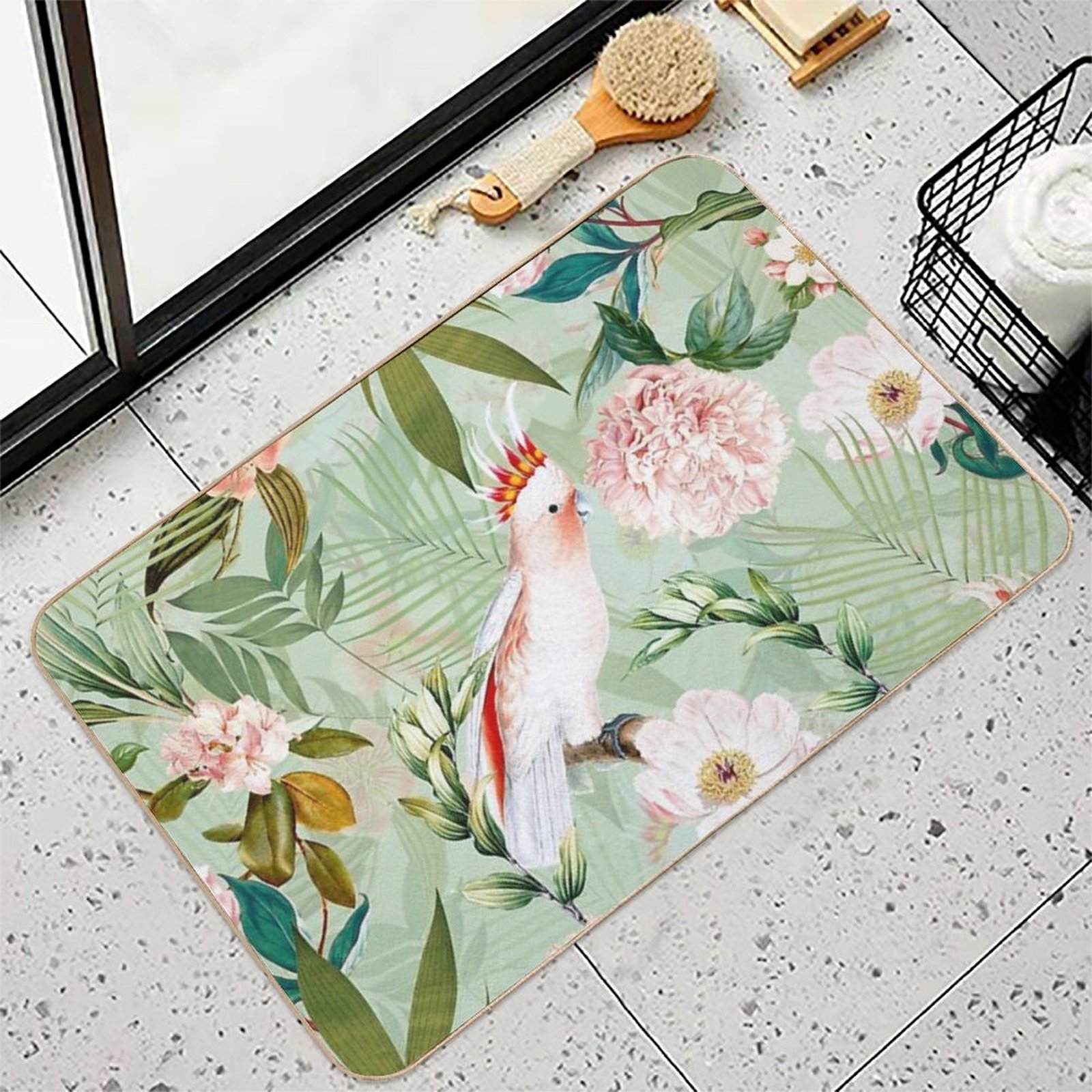 • Use as a vanity rug, guest suite accent, or mudroom defender – the Tropical Cockatoo And Jungle Botanical Garden Pattern - Mint Mat adapts to any space.